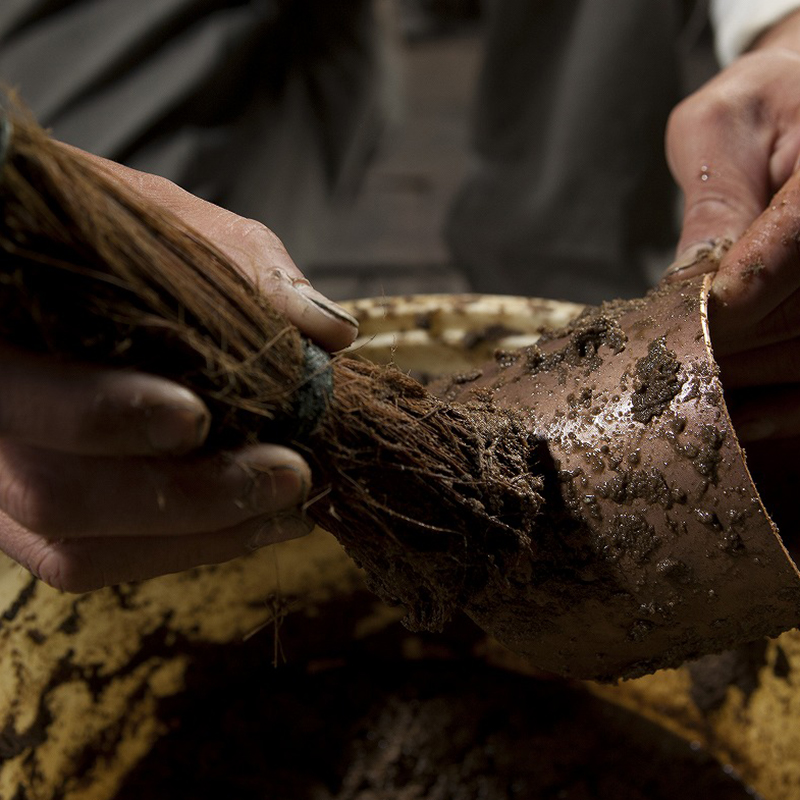 銅や真鍮製品をアンモニアで酸化させたり、カリヤスの葉と一緒に煮て下色した後、漆を塗って高温乾燥させたり、オハグロを付けながら焼き染めしたりして表面に酸化被膜をつくる技法
